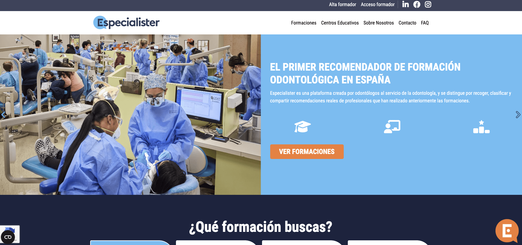 Especialister es un recomendador de formaciones creado por odontólogos al servicio de la odontología, cuyo propósito es impulsar el desarrollo profesional mediante el acceso a información veraz y actualizada. La plataforma se distingue por recoger, clasificar y compartir recomendaciones reales de profesionales que han participado en diversas formaciones, ofreciendo así una visión objetiva y fundamentada sobre cursos, grados, postgrados y másteres.