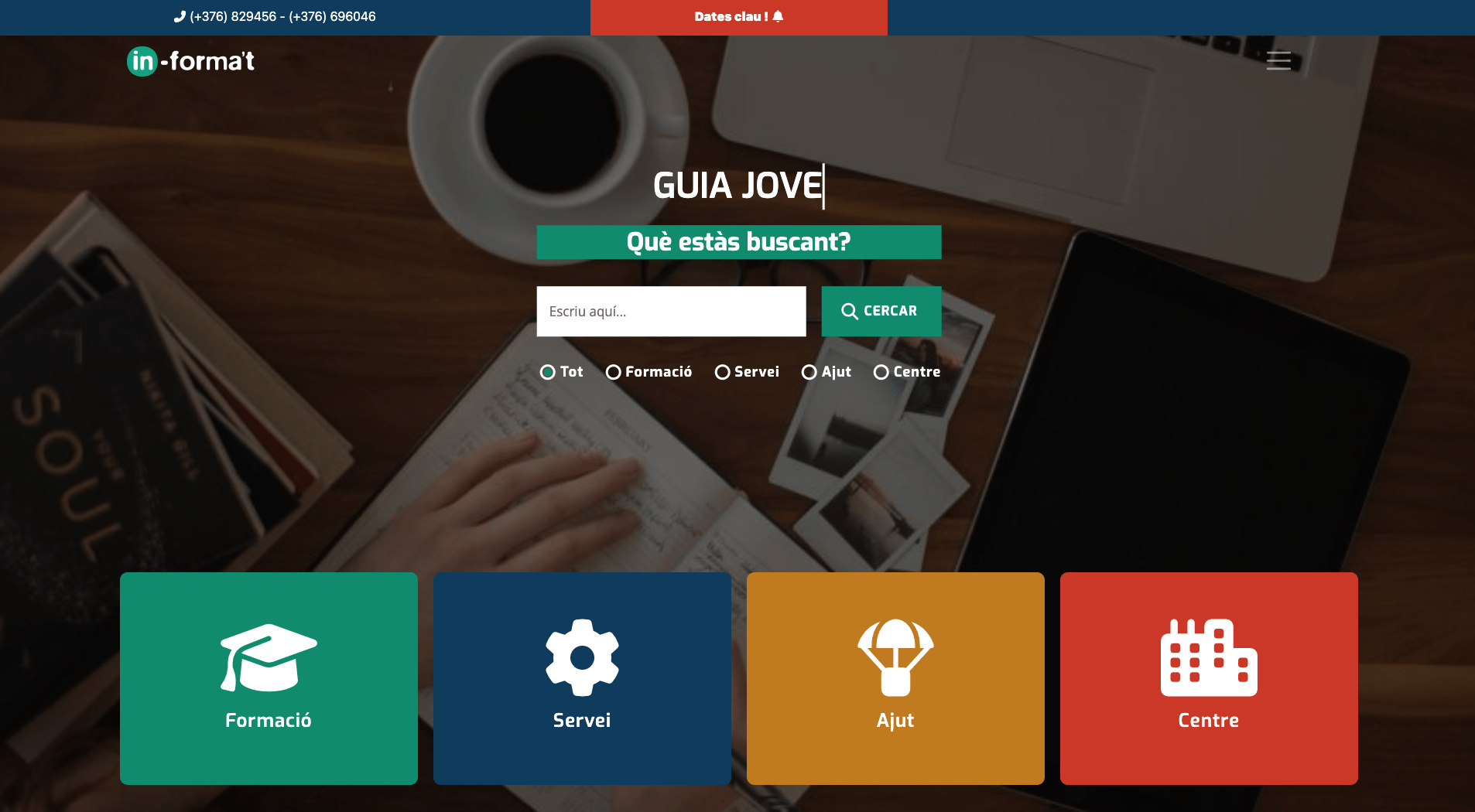 Guia Jove es una plataforma online que centraliza los servicios dirigidos a la juventud de Andorra. Su principal objetivo es ofrecer información sobre actividades, recursos y programas destinados a los jóvenes, abarcando ámbitos como la educación, el empleo, la formación, el ocio, la cultura y la salud. De este modo, la plataforma se consolida como un punto de referencia para quienes buscan ampliar horizontes, encontrar oportunidades de crecimiento personal y profesional, y participar activamente en la sociedad.